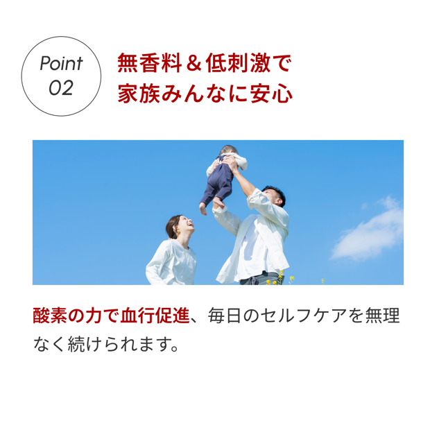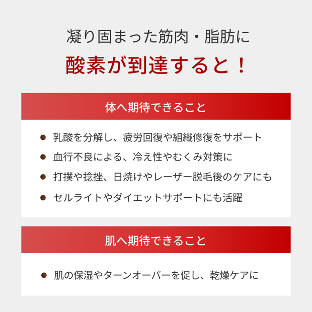 酸素の力が血行促進をサポートし、肩や腰のこわばりや重だるさ、足のむくみ、乾燥ケアまで幅広く活躍。