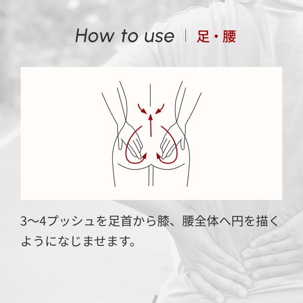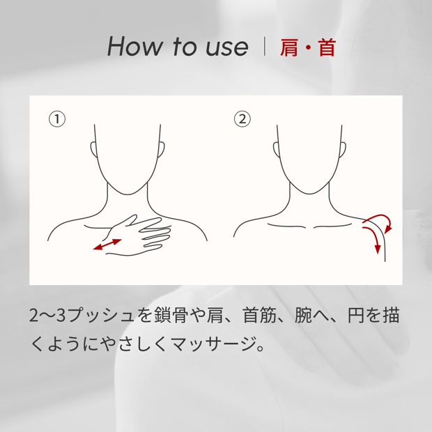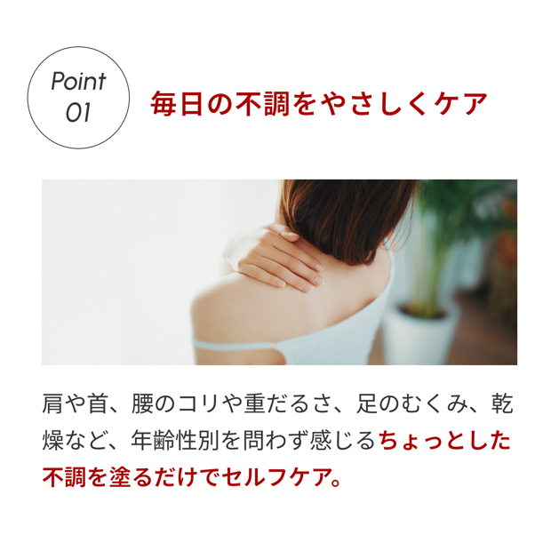 肩や首、腰のコリや重だるさ、足のむくみ、乾燥など、年齢や性別を問わず多くの方が感じる“ちょっとした不調”を塗るだけでセルフケア。