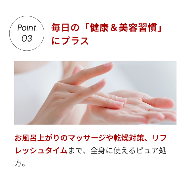 お風呂上がりのマッサージや乾燥対策、リフレッシュタイムまで、全身に使えるピュア処方。
