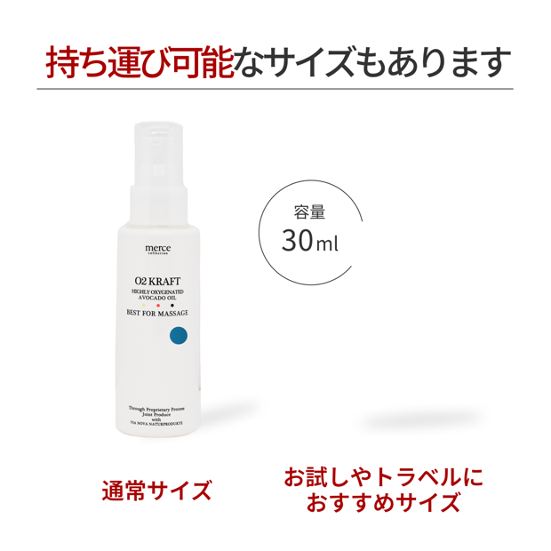 さらりとしたオイルタイプ 無香料タイプ。 ベースとなるアボカドオイル本来の香りに加え、高濃度酸素オイル特有の酸化臭(成分由来のにおい)を感じる場合があります。 香料を一切加えていないため、香りが苦手な方や、お好みのアロマをブレンドして楽しみたい方にもおすすめです。 においは品質に影響するものではありませんので、安心してご使用ください。 適量を手に取り、気になる部位にやさしくなじませてください。 【肩・首】2〜3プッシュを鎖骨や肩、首筋にやさしく塗り広げてください。 【足・腰】3〜4プッシュを足首から膝、腰全体へ円を描くようになじませます。 顔や全身、デリケートな部分にも使用可能。 お好みでエッセンシャルオイルを加えて、自分だけのアロマケアも楽しめます。 無香料・低刺激設計のため、敏感肌や小さなお子さまにもご使用いただけます(ご心配な場合はパッチテストを行ってください)。 毎日全身に使用する場合、100mlのボトルで約1ヶ月が目安です。 ・お肌に異常が生じていないかよく注意して使用してください。 ・お肌に合わない時(赤み・はれ・かゆみ・刺激等)、または直射日光が当たって同様の異常が現れた場合は、使用を中止し皮膚科専門医等にご相談ください。 ・妊娠中、授乳中の方、お子様は、高血圧、てんかん等の持病がある方はご使用前に医師または薬剤師にご相談ください。 ・傷、はれもの、湿疹等の異常がある部位には使用しないでください。 ・目に入らないようにご注意ください。万一、目に入った場合はすぐに水またはぬるま湯で洗い流してください。 ・乳幼児の手の届かないところに保管してください。 ・極端に高温または低温、多湿、直射日光のあたる場所には保管しないでください。 ・本商品には高濃度酸素オイルを配合しています。酸素オイルは成分特性上、過酸化物を含むため、開封直後でも酸化臭(特有のにおい)を感じる場合があります。開封後はアボカドオイル本来の成分香が揮発することで、酸化臭がより際立つことがありますが、未開封で3年以内、開封後は1年以内を目安にご使用ください。においや品質にご不安がある場合は、お気軽にお問い合わせください。 ・アボカド由来成分を使用しているため、アボカドアレルギーをお持ちの方は使用をお控えいただくか、必ずパッチテストを行ってからご使用ください。また、ラテックスアレルギーをお持ちの方は「ラテックスフルーツ症候群」により交差反応を起こす可能性があるため、十分ご注意ください。 ・敏感肌の方やご心配な方、はじめてお使いになる際は、ご使用前に必ずパッチテストなどでお試しのうえご使用ください。 ①高濃度酸素オイルで毎日の不調をやさしくケア ②無香料&低刺激で家族みんなに安心 ③毎日の“健康&美容習慣”にプラス O2クラフトピュアは「家族で安心して使える酸素オイル」として誕生しました。 肩や腰のこわばり、足のむくみ、乾燥など、日常で多くの方が抱える悩みにやさしく対応します。 酸素が疲労物質(乳酸)を分解し、疲労回復や組織修復をサポート。 血行不良からくる冷えやむくみにも効果的で、炎症物質に働きかける消炎作用により、打撲・捻挫・日焼け・レーザー脱毛後のケアにも活躍します。 さらに、酸素補給によって皮膚細胞の水分保持力やターンオーバーを整え、乾燥肌のケアにも◎。 脂肪分解酵素リパーゼを活性化し、セルライトやダイエットサポートにも役立ちます。 無香料・低刺激のピュア設計だから、敏感肌やお子さまのケアにも安心。 お好みのアロマをプラスして、自分だけのケアオイルにカスタマイズすることも可能です。 毎日の暮らしに“ピュアなやさしさ”をプラスし、体も心も軽やかに整える一本をぜひ。商品の形状