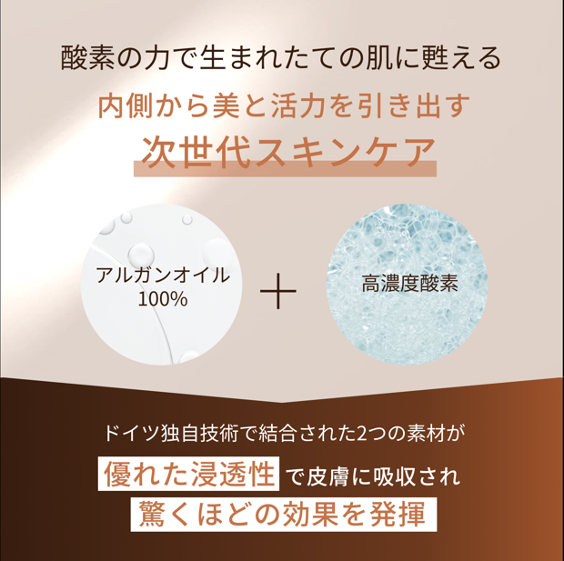 少しとろみのあるオイルタイプ 無香料。 アルガンオイル本来の香りに加え、高濃度酸素オイル特有の酸化臭(成分由来のにおい)を感じる場合があります。 香料を一切加えていないため、香りが苦手な方にもおすすめ。お好みでアロマをブレンドして楽しむことも可能です。 においは品質に影響するものではございませんので、安心してご使用いただけます。 洗顔後、化粧水の前に6〜10滴を手のひらにとり、顔全体に優しくなじませてください。 特に乾燥やハリのなさが気になる部分には、重ね塗りもおすすめ。 顔全体にのばした後、軽くハンドプレスすると浸透感が高まります。 朝晩のケアに、マッサージ感覚でお使いください。 ・お肌に異常が生じていないかよく注意して使用してください。 ・お肌に合わない時(赤み・はれ・かゆみ・刺激等)、または直射日光が当たって同様の異常が現れた場合は、使用を中止し皮膚科専門医等にご相談ください。 ・傷、はれもの、湿疹等の異常がある部位には使用しないでください。 ・目に入らないようにご注意ください。万一、目に入った場合はすぐに水またはぬるま湯で洗い流してください。 ・乳幼児の手の届かないところに保管してください。 ・極端に高温または低温、多湿、直射日光のあたる場所には保管しないでください。 ・本商品は高濃度酸素を含有したアルガンオイルです。酸素オイルは成分特性上、過酸化物を含むため、開封直後でも酸化臭(特有のにおい)を感じる場合があります。開封後はアルガンオイル本来の香りが揮発することで、酸化臭がより際立つことがありますが、未開封で3年以内、開封後は1年以内を目安にご使用ください。においや品質にご不安がある場合は、お気軽にお問い合わせください。 ・敏感肌の方やご心配な方、はじめてお使いになる際は、ご使用前に必ずパッチテストなどでお試しのうえご使用ください。 ・本商品は容器サイズに対して内容量が少なめに見える場合がありますが、これは専門店向けのカスタマイズ用美容成分(後入れ用エッセンス)を追加できる仕様となっているためです。 ・通常のご使用にあたっては、既に十分な機能・効果を発揮するよう設計されており、不良品ではありませんのでご安心ください。 ・カスタマイズ用エッセンスは認定サロン専用のサービスです。ECサイトで販売の本商品には含まれておりません。 ①酸素とアルガンオイルの力で肌環境を整える ②バリア機能を回復し「美強肌」へ ③シンプル&効果的なミニマルケア 酸素は細胞のエネルギー生産に欠かせない存在で、肌に十分に行き渡ることで代謝がサポートされ、ハリや弾力の維持に関与すると考えられています。 酸素が不足するとくすみの原因になるともいわれており、酸素供給は血流を後押しし、いきいきとした肌印象へとつながります。 また、酸素は水分保持にも関与しているとされ、乾燥や小じわのケアにも期待が寄せられています。 さらに筋肉や組織への酸素供給がこりを和らげ、フェイスラインをすっきり見せる効果を感じたという声も届いています。 実際のユーザーからは、 「乾燥やくすみで疲れて見えていた肌が、ふっくら柔らかくなった」 といった、日常的な使いやすさや実感に対する評価が多く寄せられています。商品の形状