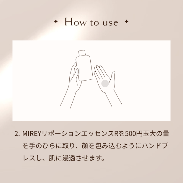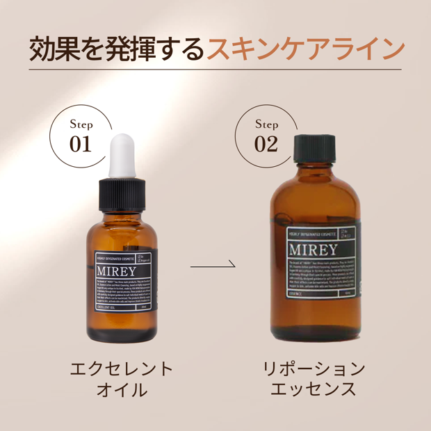 MIREYエクセレントオイルとMIREYリポーションエッセンスの2ステップでスキンケアが完了。